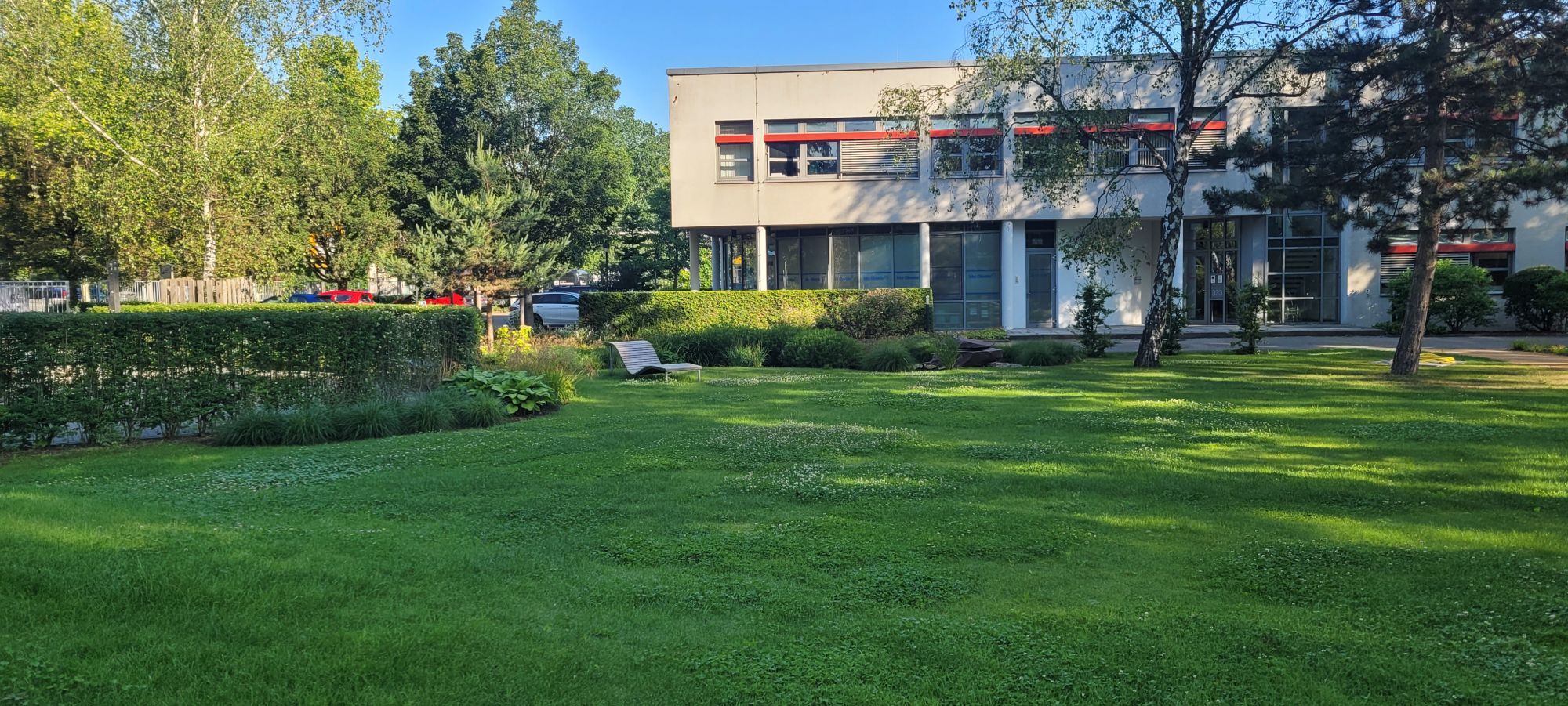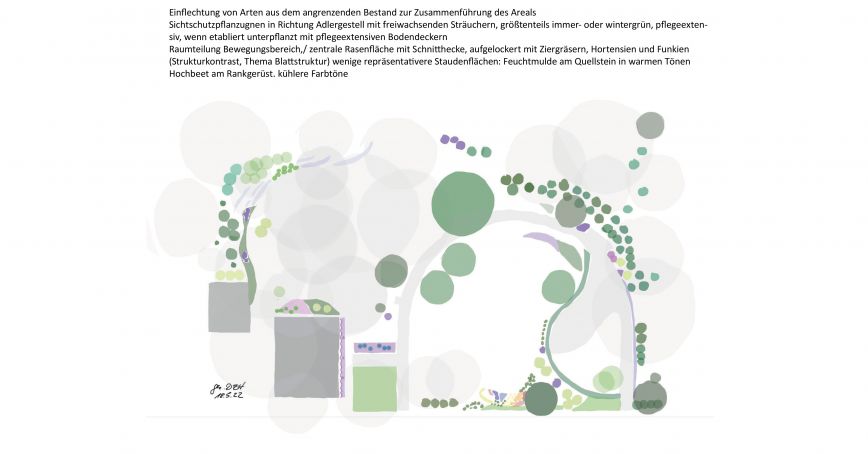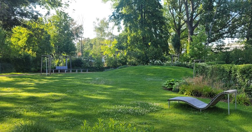 wesentliche Projektmerkmale: Anlage zwischen Park und Garten mit Fokus auf Vegetationskonzept, Sichtschutz/ Raumbildung mit landschaftlichen Elementen, aktive und passive Erholung in den Pausen