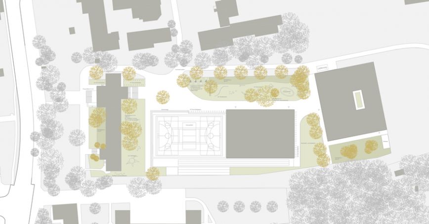 Einbindung der Sportanlagen - weiche Raumbildung mit Pflanzungen an den Rändern und als Einzelinterventionen zur Raumgliederung und Förderung des Naturerlebens im Laufe der Jahreszeiten.