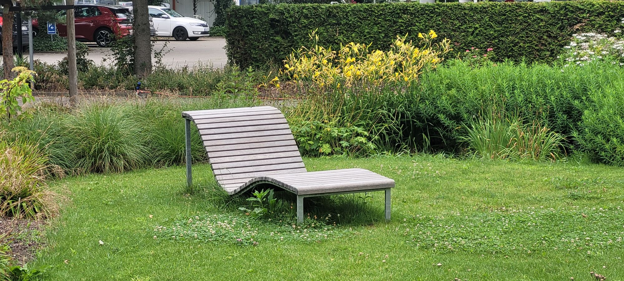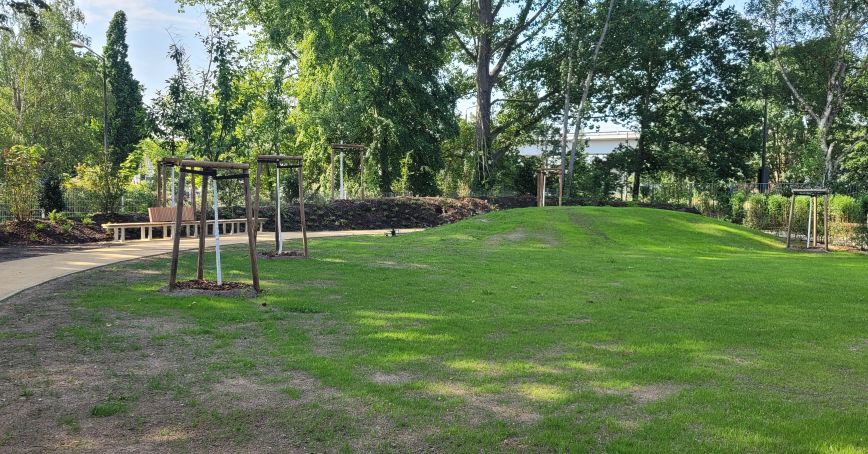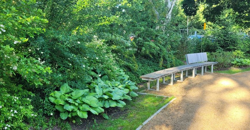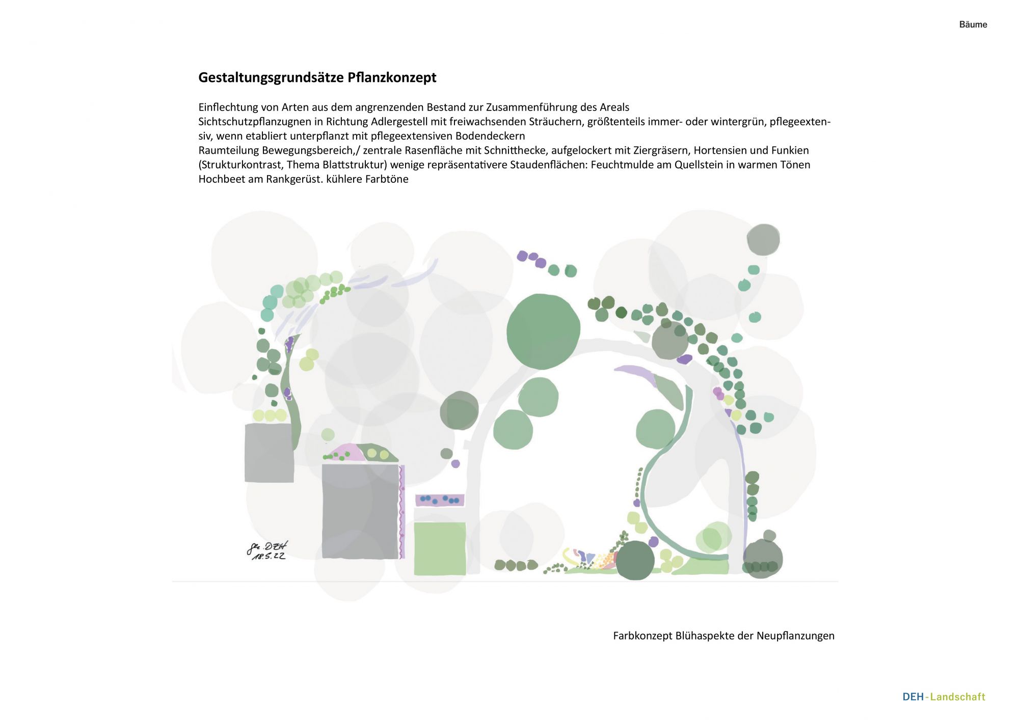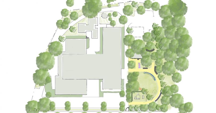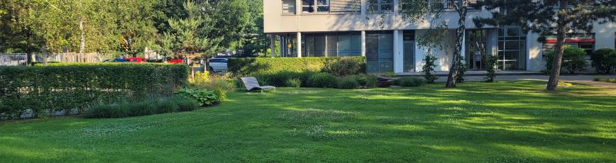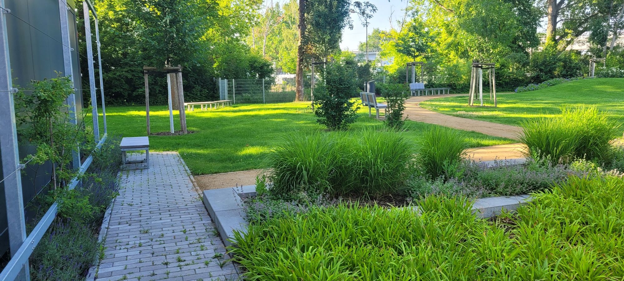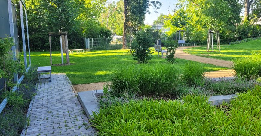 wesentliche Projektmerkmale: Anlage zwischen Park und Garten mit Fokus auf Vegetationskonzept, Sichtschutz/ Raumbildung mit landschaftlichen Elementen, aktive und passive Erholung in den Pausen